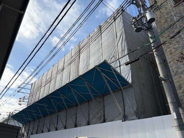 落下物防止対策の徹底:写真上部に見える「朝顔(アサガオ)」を設置。万が一の資材落下も地上へ落とさない鉄壁の防御体制を整えています。