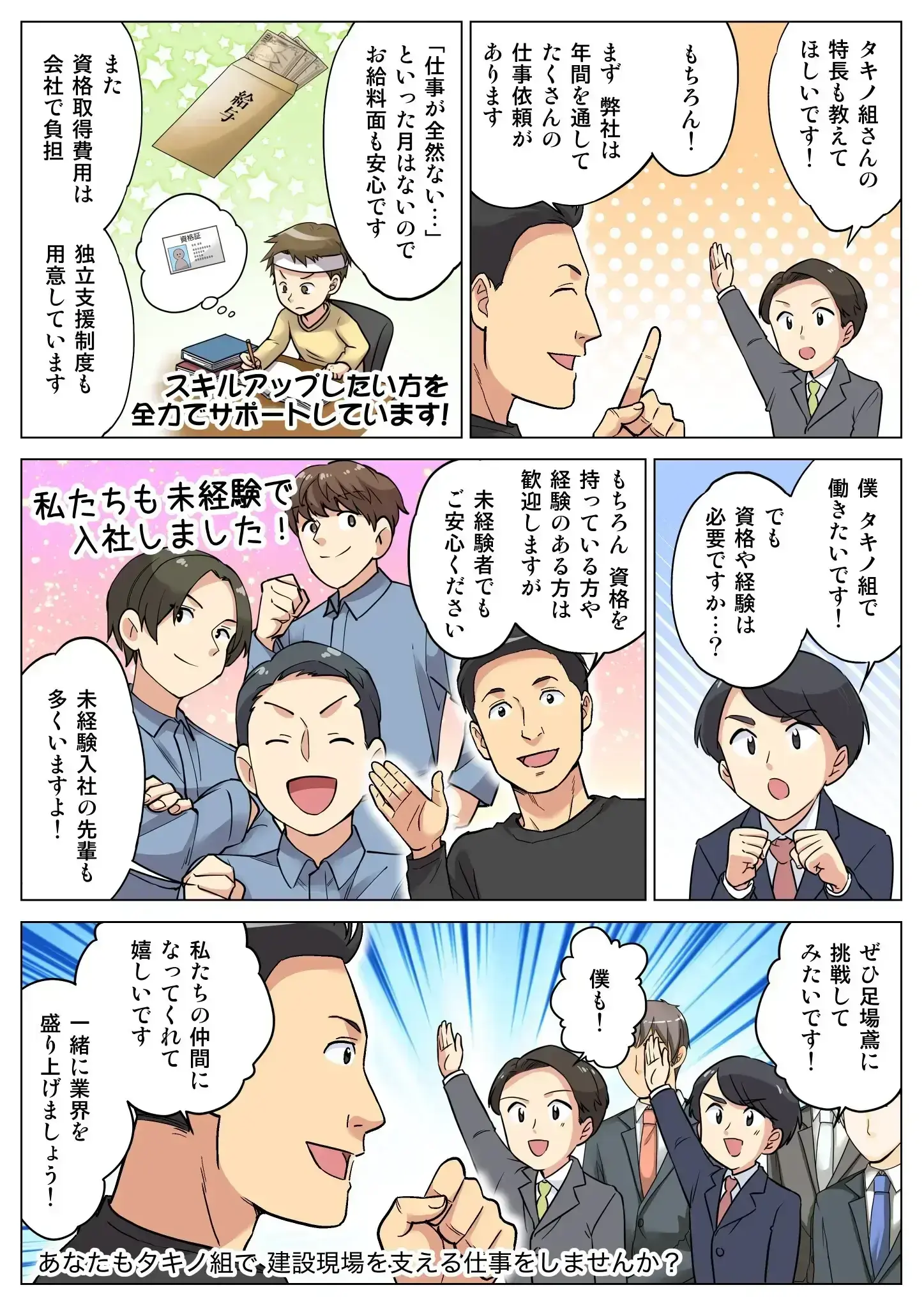 もっと自分の技術や経験を活かしたいという方も大歓迎です。「自分はもっと出来るんじゃないか?」と今の職場で思ったら、ぜひタキノ組へ来てください。